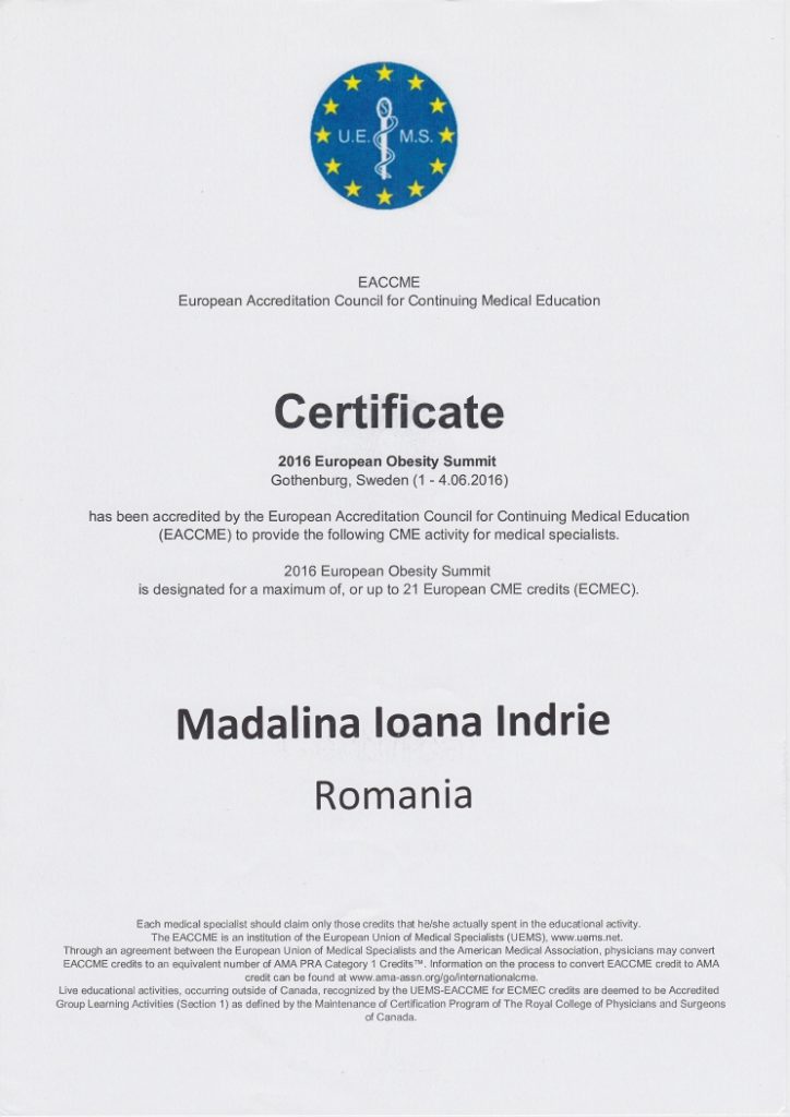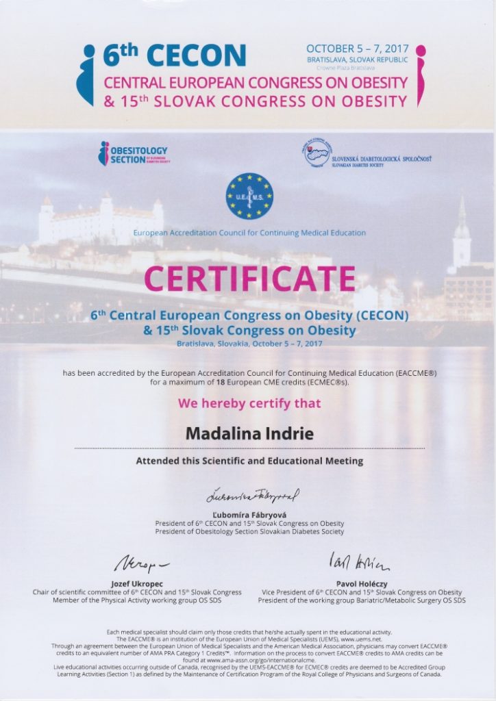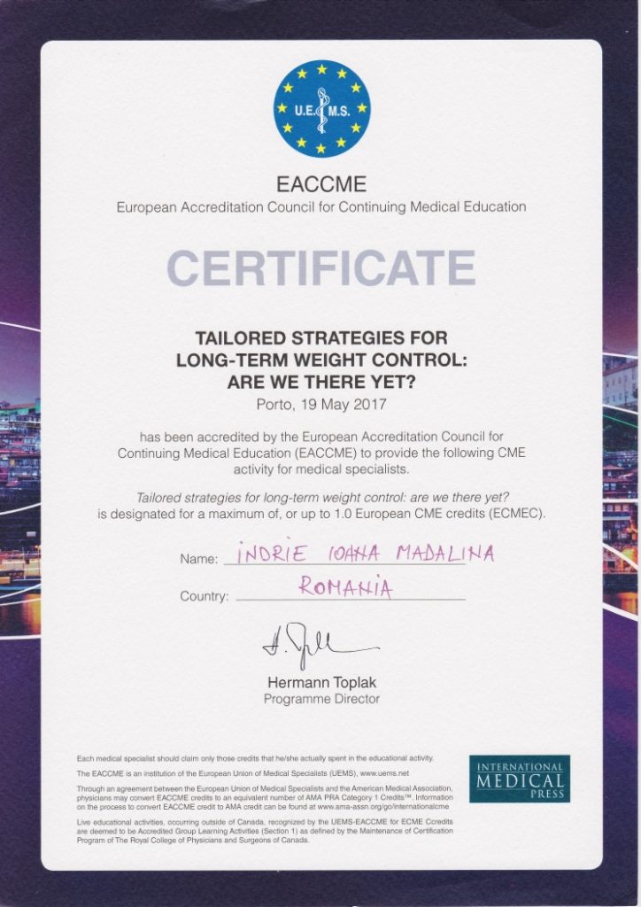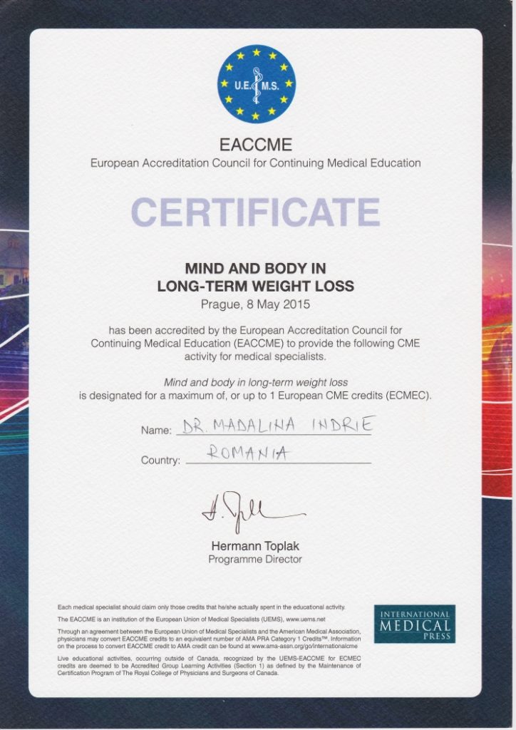 - Specialist in Obezitate, acreditat de Federatia Internationala de Obezitate