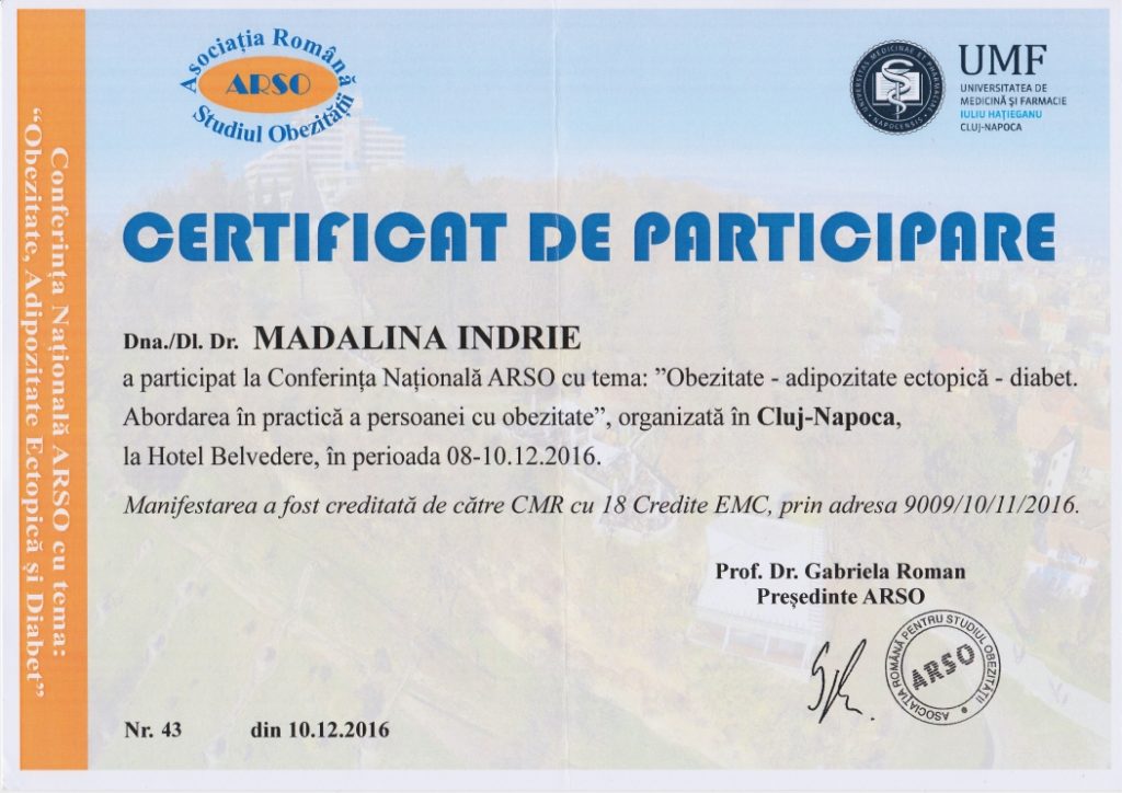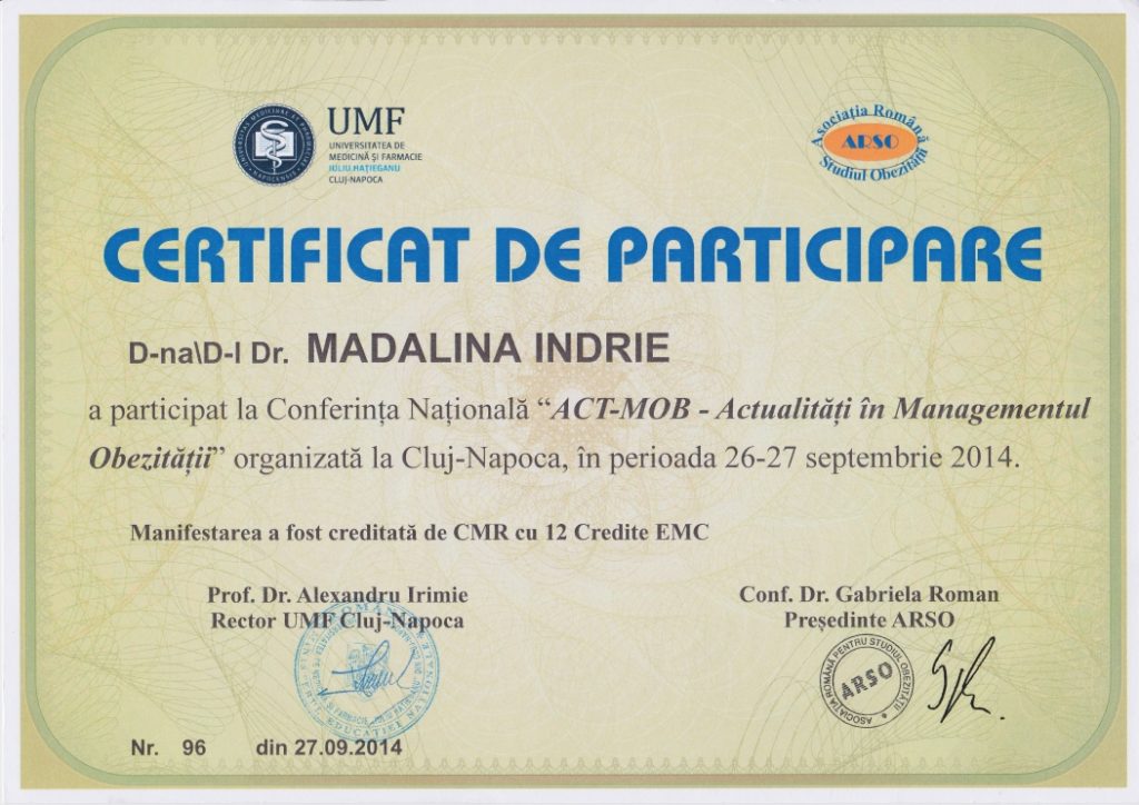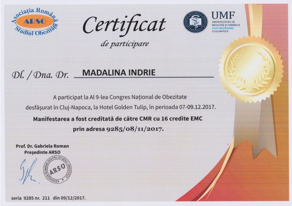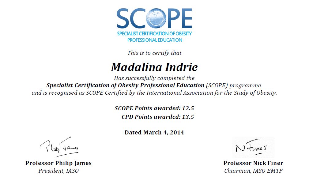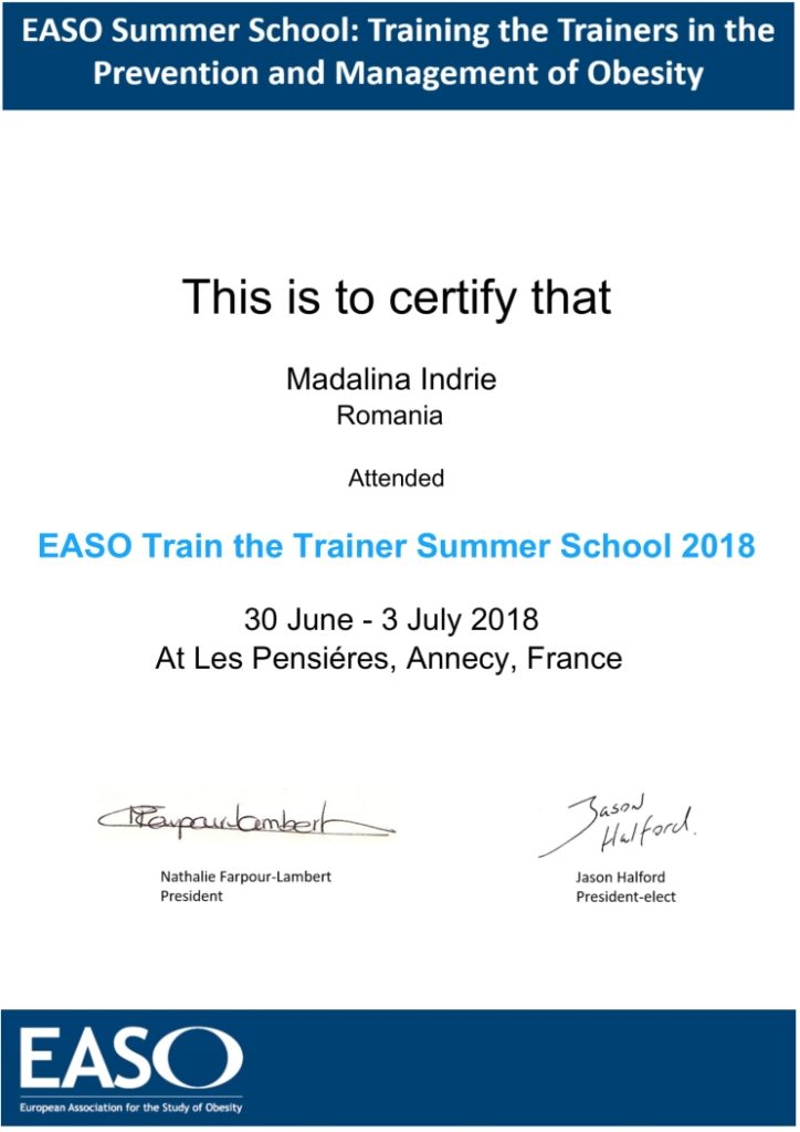 - Specialist in Obezitate, acreditat de Federatia Internationala de Obezitate